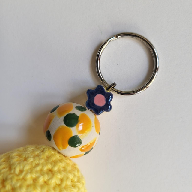 A bright and cheerful chunky keyring or bag charm - These are made with two unique hand painted ceramic beads and a central crocheted bead. They have a secret, too, as each crocheted bead recycles the plastic ball from a roll-on deodorant bottle.