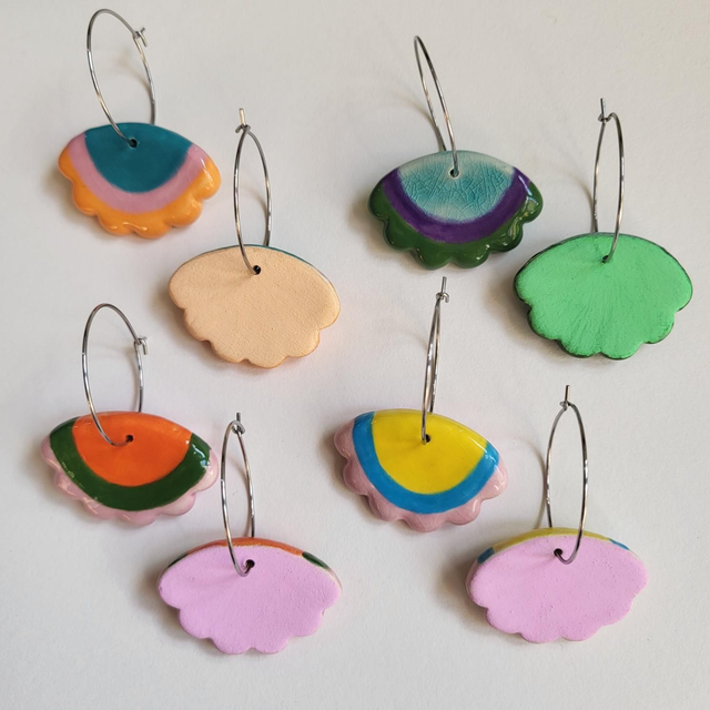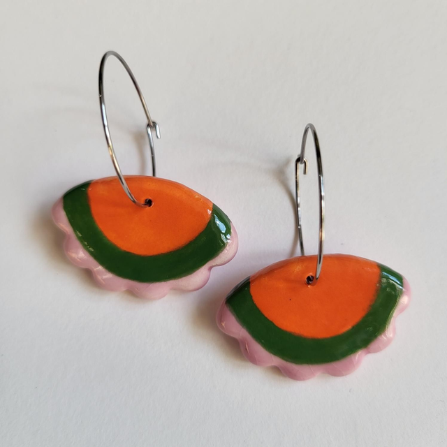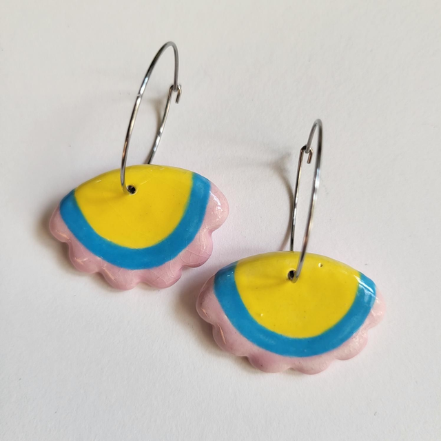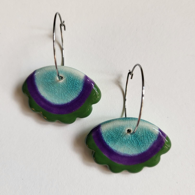 Add a bit of joyful "flouncing" to your day with these bright, colourful earrings. Hand cut with a lovely scalloped edge and hand painted in vibrant glazes, being slightly smaller than their larger counterparts, they still shout "look at me" but in a slightly quieter voice. Designed to move with the wearer, these ceramic earrings are suspended from surgical steel hoops.