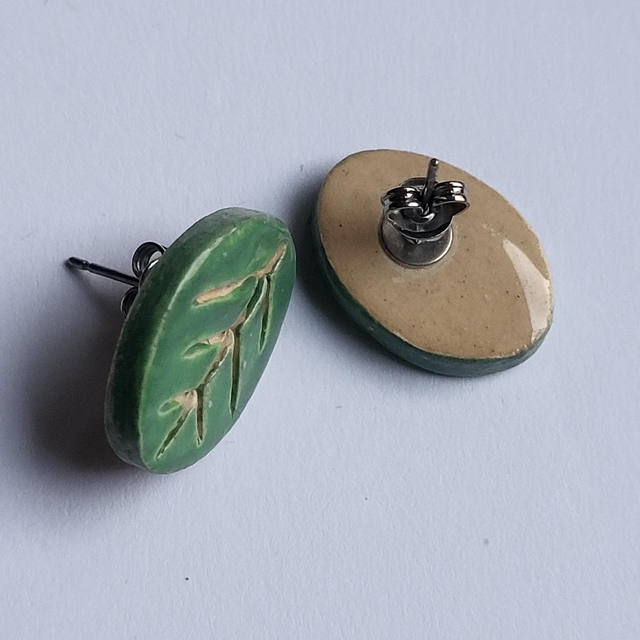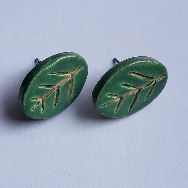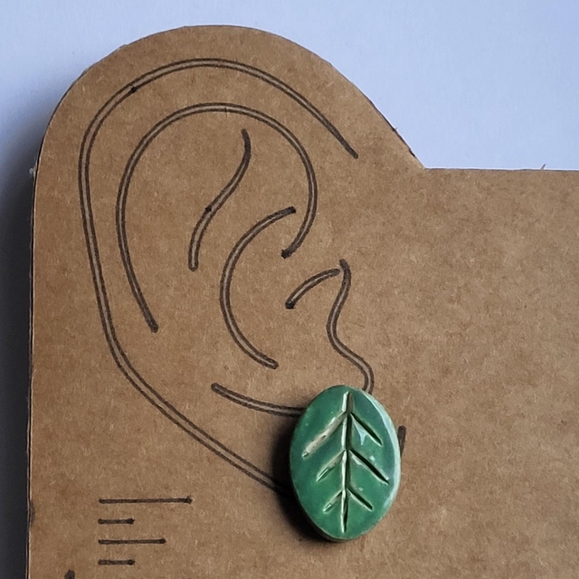 Add a little spring to your ears with these simple leaf shaped ceramic earrings. Hand cut, engraved, and glazed in soft green.