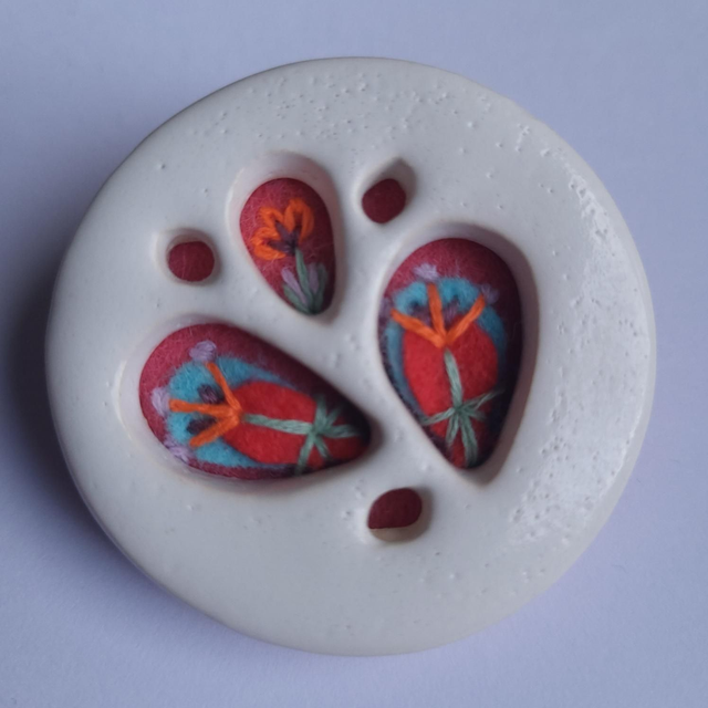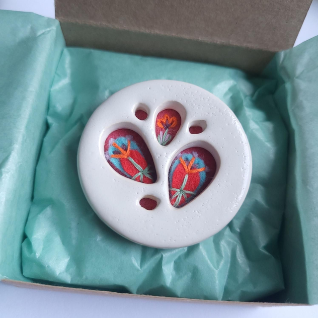 The ceramic "open petal" shape is carefully cut and then glazed with white speckled glaze. Once fired, a layer of pink wool felt has been added, and delicately hand embroidered and appliqued with a floral motif, inspired by the cacti & mid-century designs/colours. Finished with a birch wood ply back and brooch pin, which is secured with matching mint embroidery thread. Each "Secret Garden" comes in one of my fully recyclable gift boxes, so perfect for giving as a present if your not treating yourself.